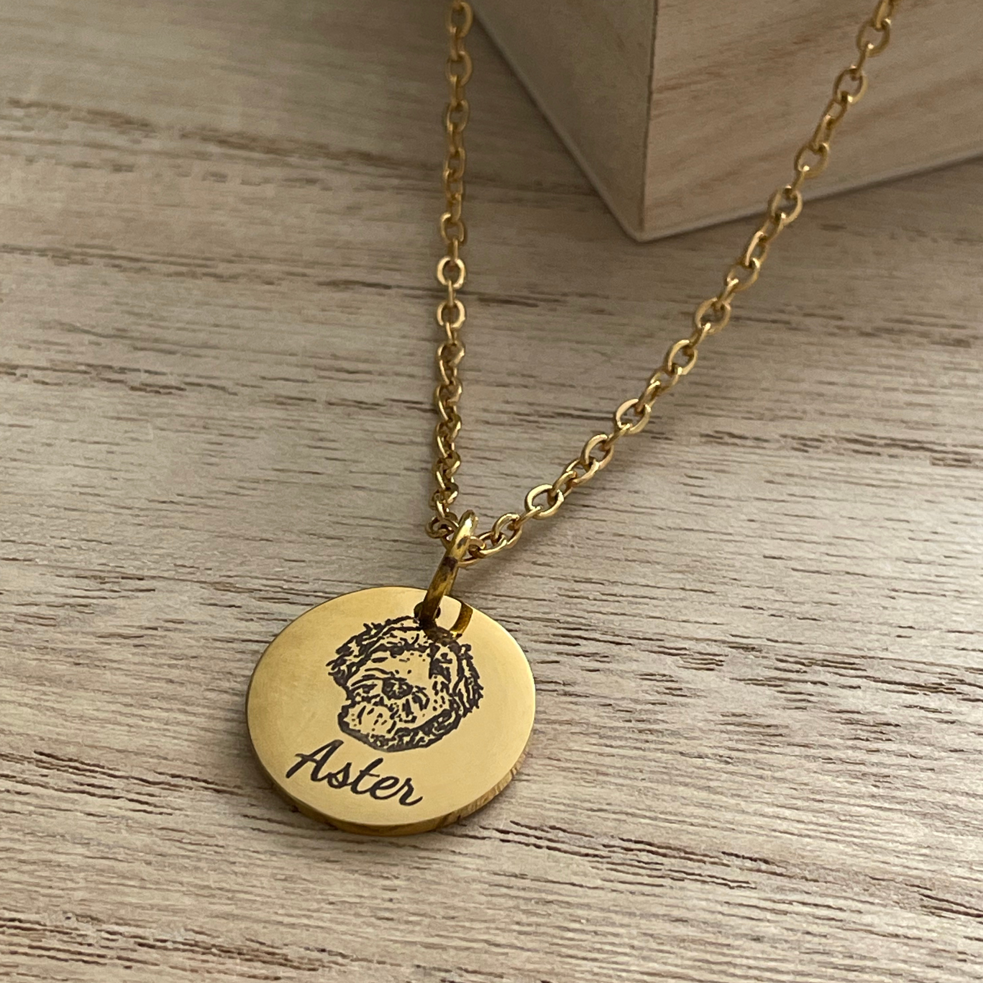 Custom Gold Pet Portrait Necklace with personalized name engraving. Upload a clear, bright photo for a detailed engraved portrait. Perfect gift for dog moms, cat lovers, pet memorials, and personalized jewelry collections. Tarnish-resistant, hypoallergenic, and designed for everyday wear.